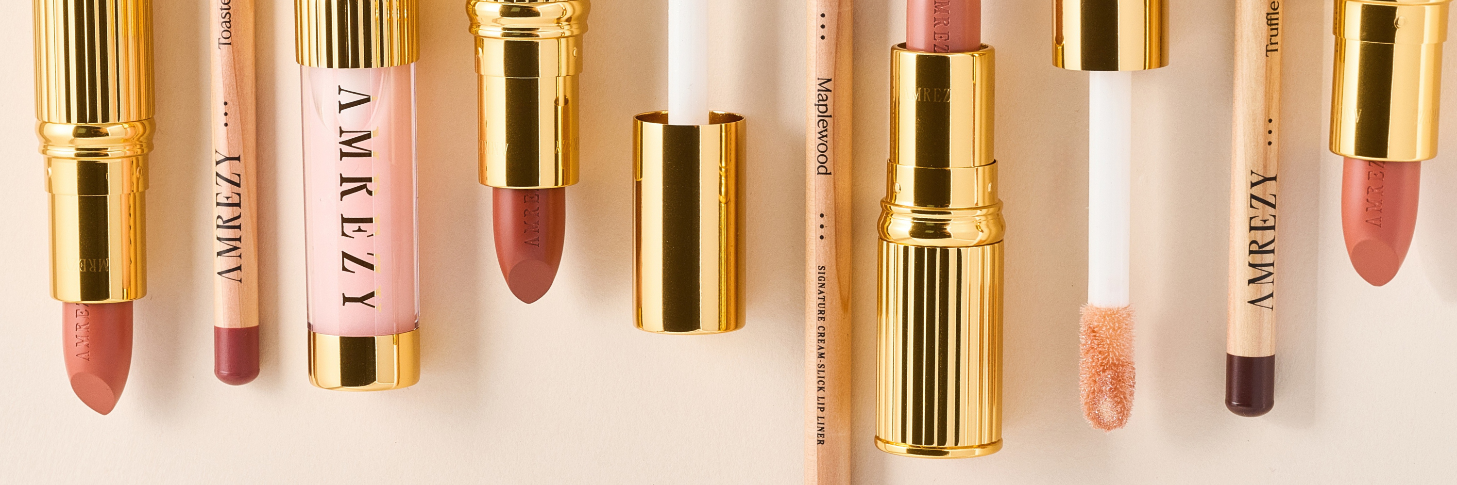 Save $10.00Amra's Signature Lip EditCollection of lip products including lip glosses and a lipstick on a beige background.